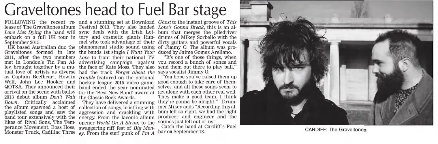 On this day, 18 September 2015, UK-based Australian two-piece heavy blues rock and roll band The Graveltones played Cardiff’s Spillers Records and the Fuel Bar.
