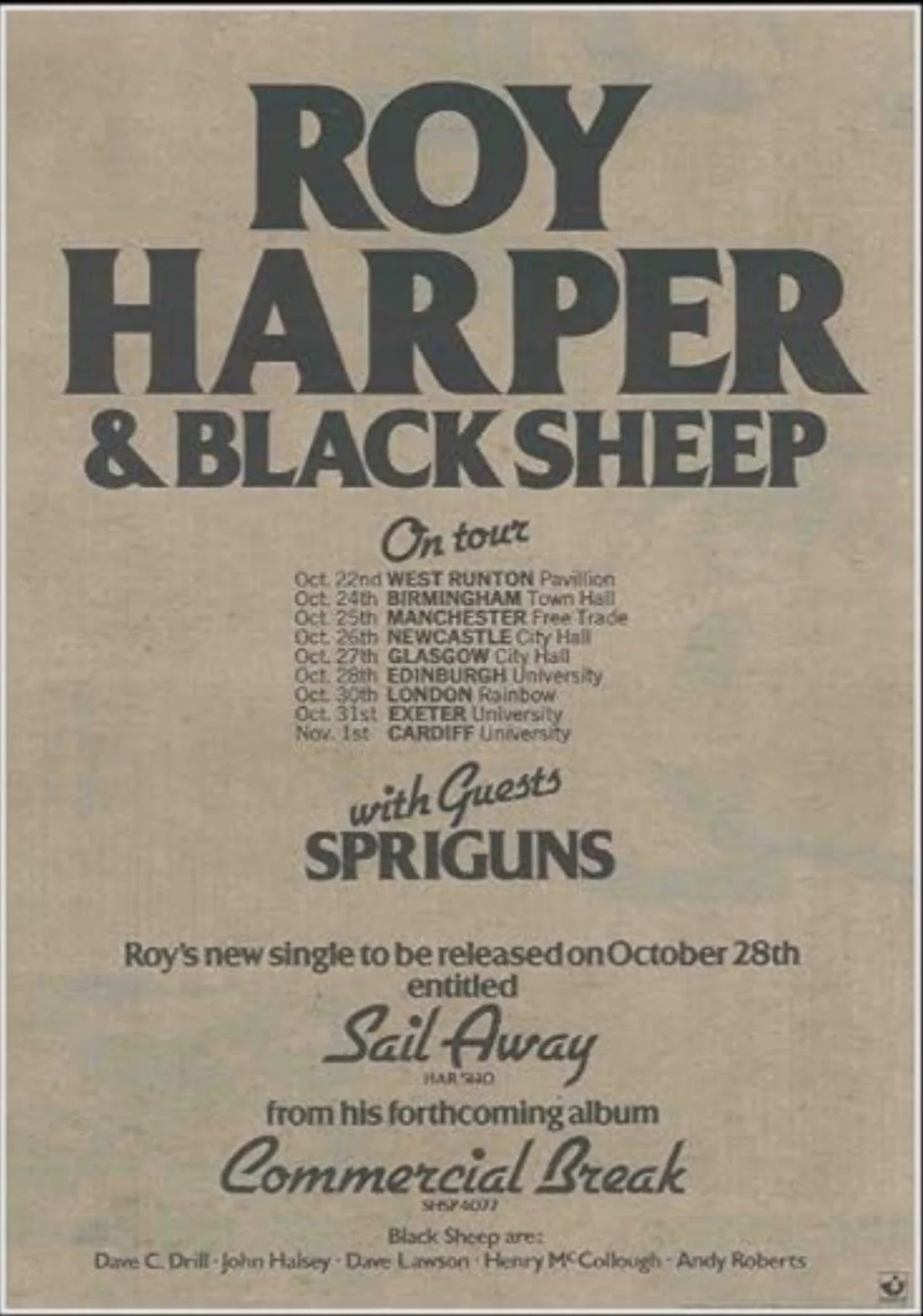 On this day, 1 November 1977, folk/rock singer songwriter and guitarist Roy Harper played Cardiff University with support supplied by The Spriguns.
