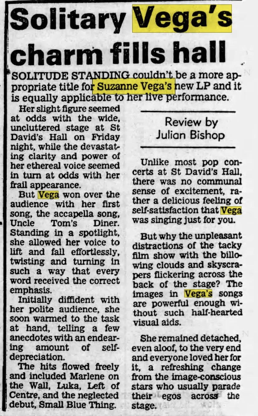 On this day, 5 June 1987, American singer-songwriter Suzanne Vega played Cardiff’s St David’s Hall. Vega had just released her second studio album Solitude Standing.