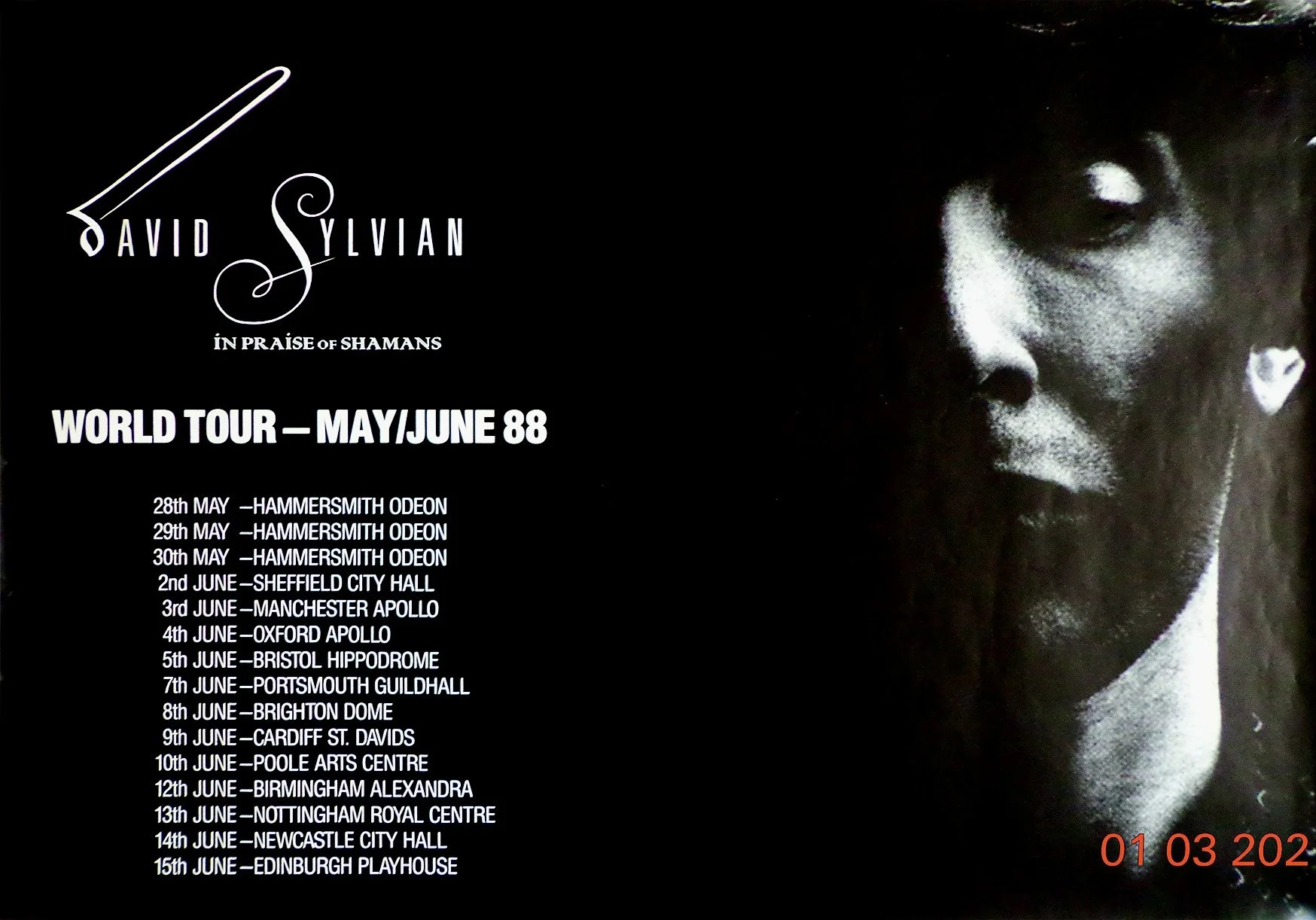 The album was followed by his first live outing as a solo artist, in an 80-day world tour called "In Praise of Shamans", from March to June 1988. Alongside Sylvian were Jansen, Barbieri, guitars and keyboards from Robbie Aceto, brass and sax from Mark Isham, bass from Ian Maidman and lead guitar from David Torn. There were no songs from Sylvian's former band Japan in the setlist.