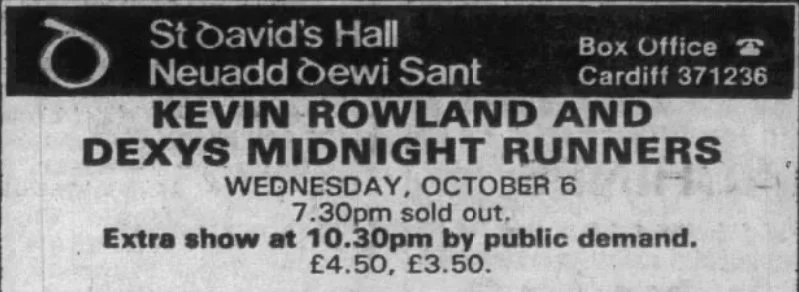 On this day, 6 October 1982, Midlands band Dexys Midnight Runners played Cardiff St David’s Hall on "The Bridge" tour. The band were accompanied by new-recruits, Spike Edney on trombone and saxophonist Kevin Gilson.