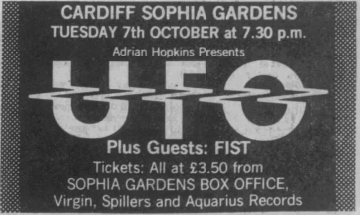 On this day, 7 October 1980, hard rock band UFO played Cardiff’s Sophia Gardens on their The Wild, the willing and the innocent tour. Support was provided by Fist.