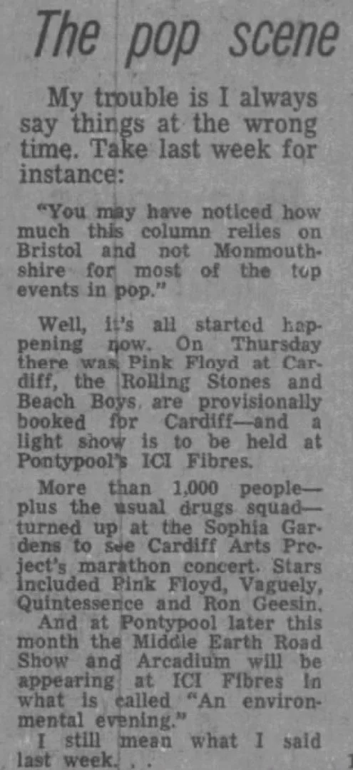 On this day, 5 February 1970, prog rock giants Pink Floyd played Cardiff’s Sophia Gardens as part of Cardiff Art Projects marathon concert which also featured Quintessence and Ron Geesin.