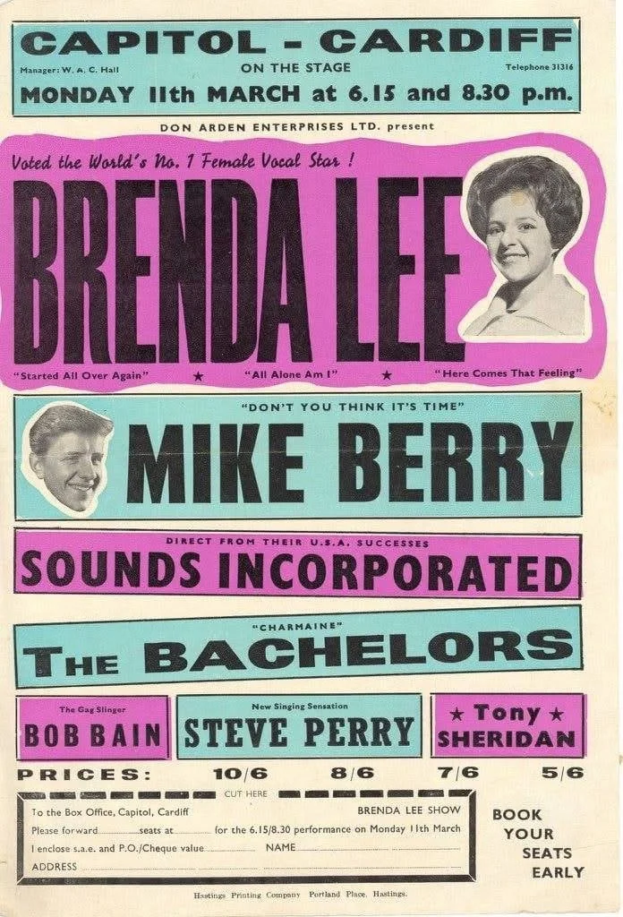 On this day, 11 March 1963, American singer Brenda Lee played Cardiff’s Capitol Theatre headlining a package that included Mike Berry, Sounds Incorporated, The Bachelors, Steve Perry, Tony Sheridan and Bob Bain.