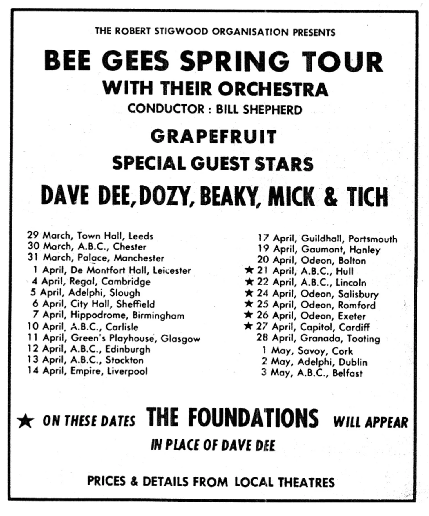 The Bee Gees embarked on their first major UK tour in early 1968, opening at the Royal Albert Hall in London on March 27, 1968, featuring a 37-piece orchestra and choir. The tour, which ran through late March and April, included stops in cities like Sheffield, Birmingham, Leeds and Manchester.