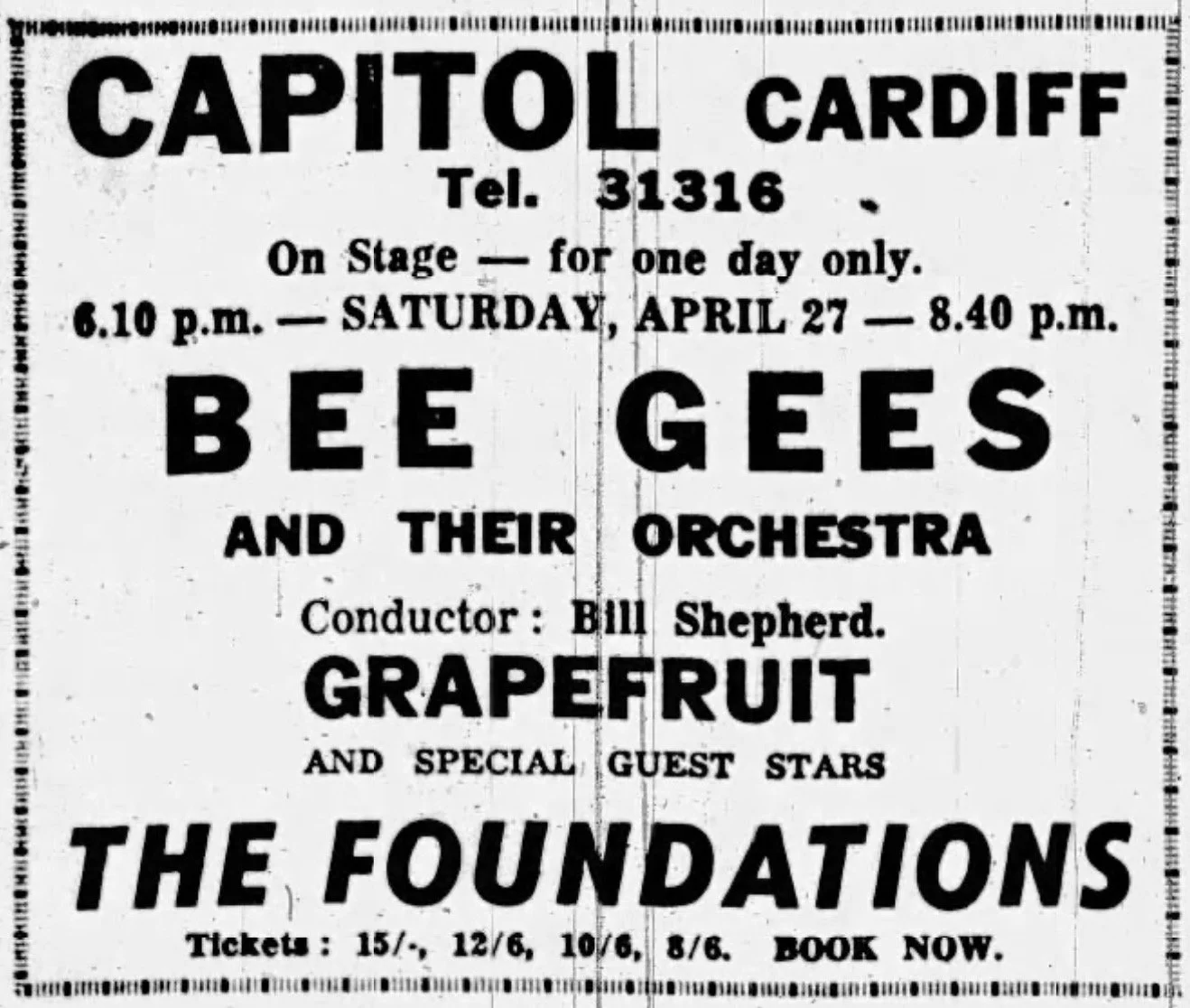 On this day, 27 March 1968, Australian singer/ songwriting brothers the Bee Gees played Cardiff’s Capitol Theatre. Support was provided by Grapefruit and The Foundations.
