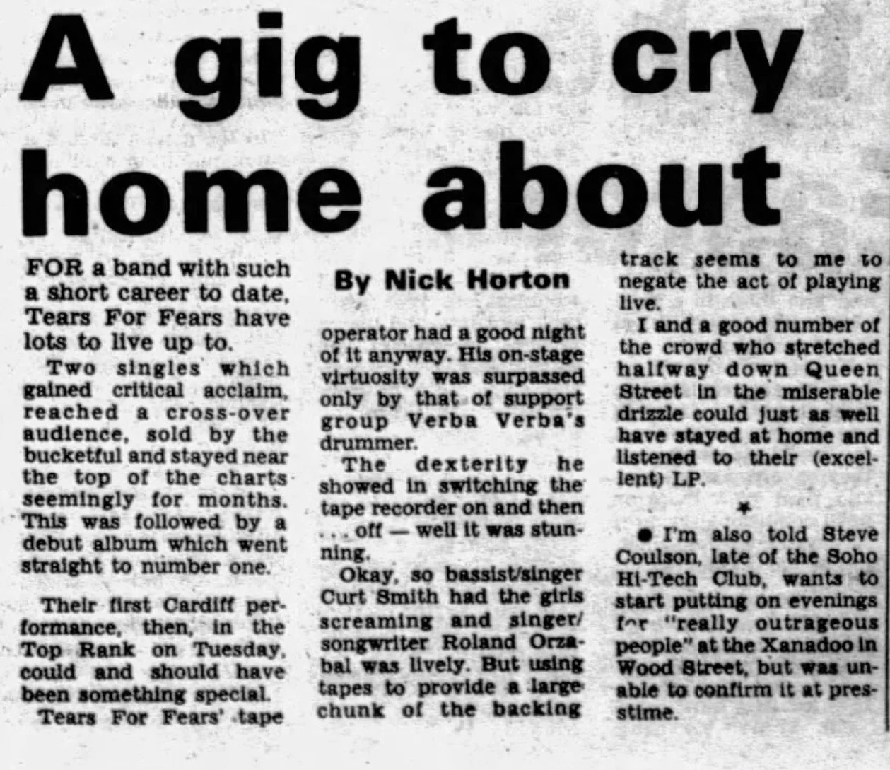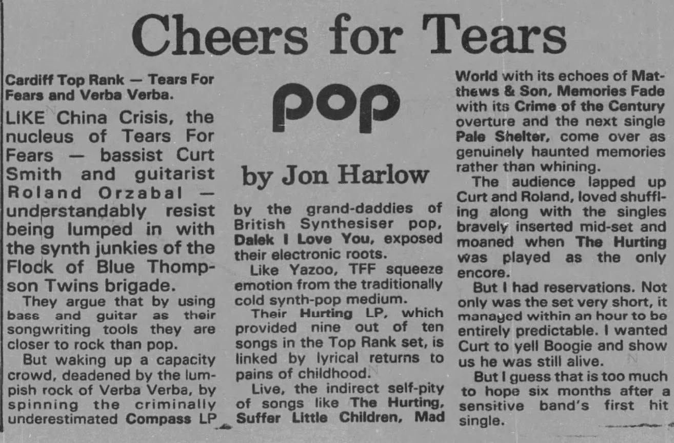 On this day, 29 March 1983 rock band Tears for Fears played Cardiff’s Top Rank. Support was provided by Verba Verba.