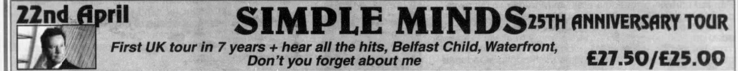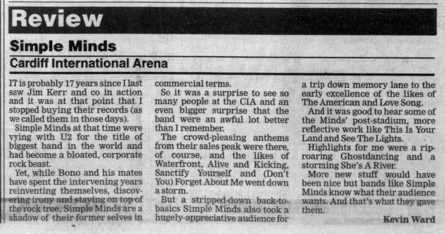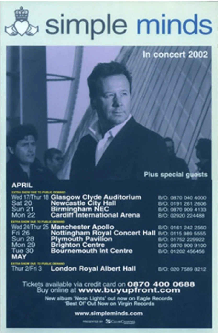 On this day, 22 April 2002, Scottish rock band Simple Minds played Cardiff International Arena on their "The Floating World Tour" support was provided by The Real People.
