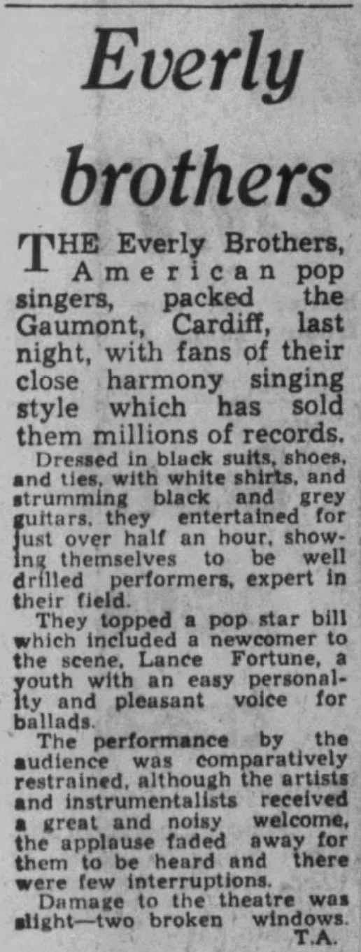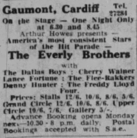 On this day, 25 April 1960, American musical duo The Everly Brothers played Cardiff’s Gaumont Theatre with support provided by The Dallas Boys, Lance Fortune, Cherry Walner, The Flee-Rakkers, Danny Hunter and The Freddy Lloyd Four.