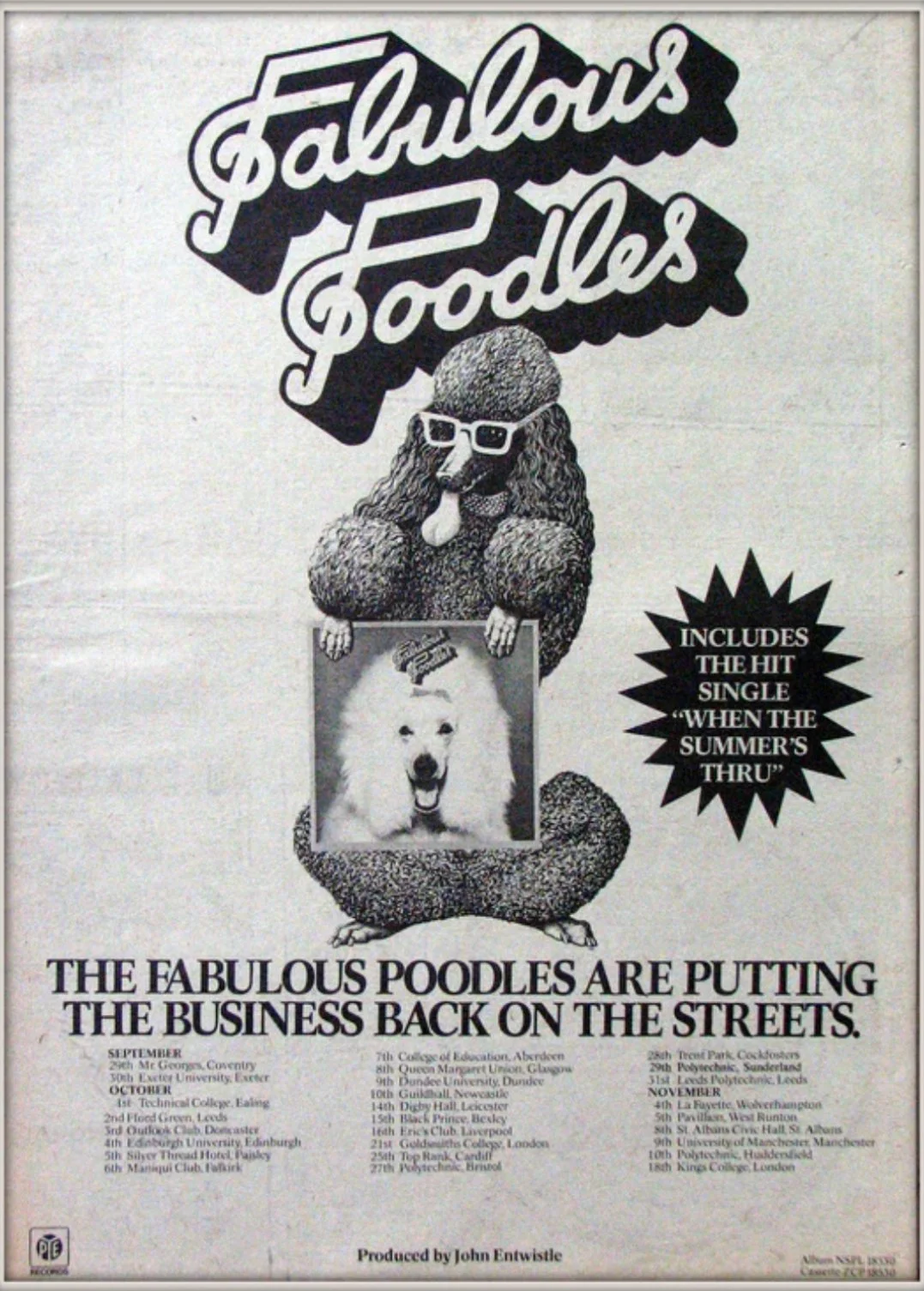 In 1977, they signed with Pye Records, and their debut album, simply titled The Fabulous Poodles and produced by John Entwistle of the Who, appeared later that year. While the album received a positive review from rock critic and DJ John Peel and earned the band a spot on the BBC music series The Old Grey Whistle Test (where the group's antics managed to outrage host Bob Harris), the album didn't fare well commercially, despite extensive touring in the U.K. and Europe.