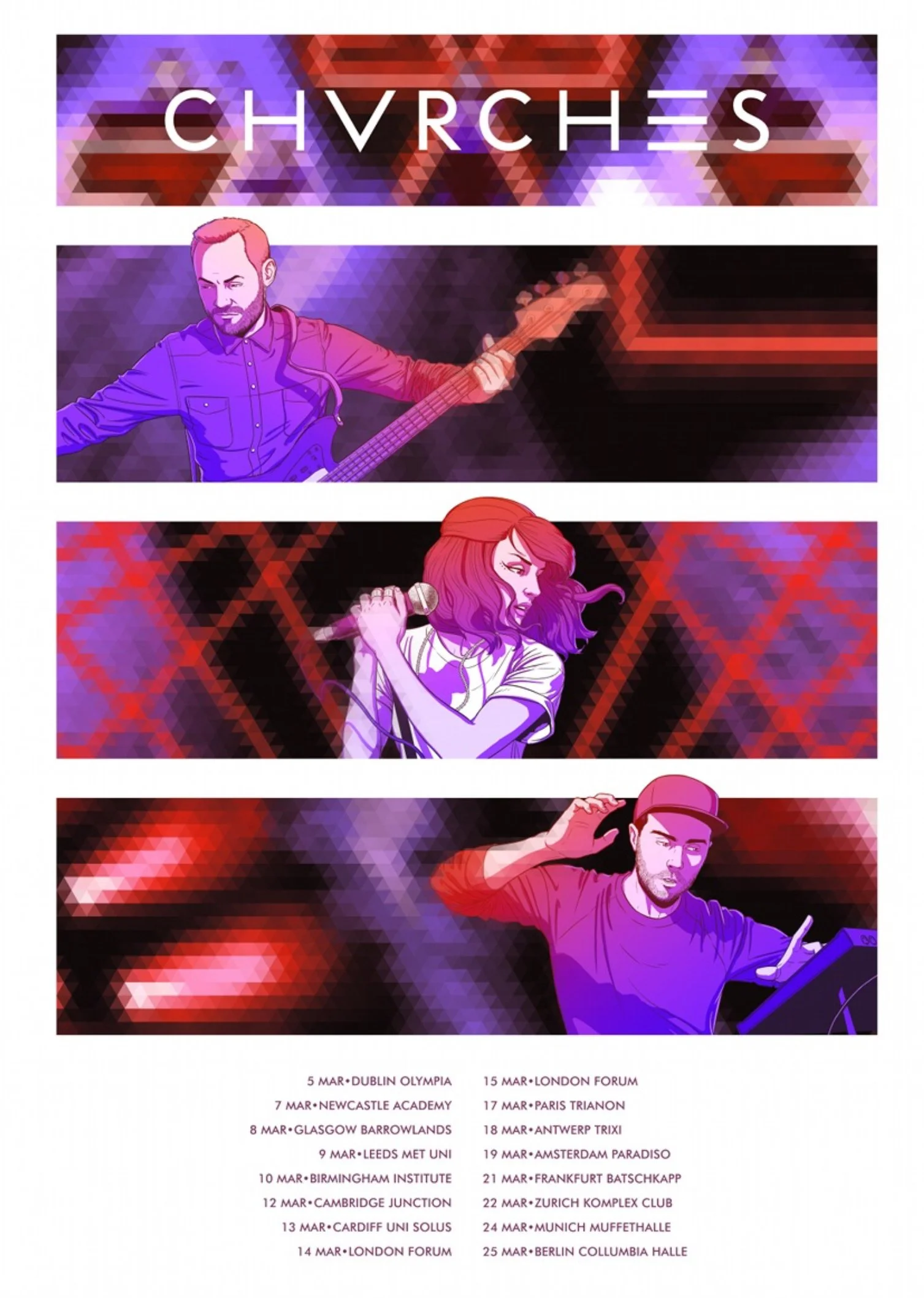 Formed in September 2011. The band consists of Lauren Mayberry, Iain Cook, Martin Doherty and, unofficially since 2018, Jonny Scott.Mostly deriving from the synth-pop genre, Chvrches also incorporate indietronica, indie pop, and electronic dance into their sound.
