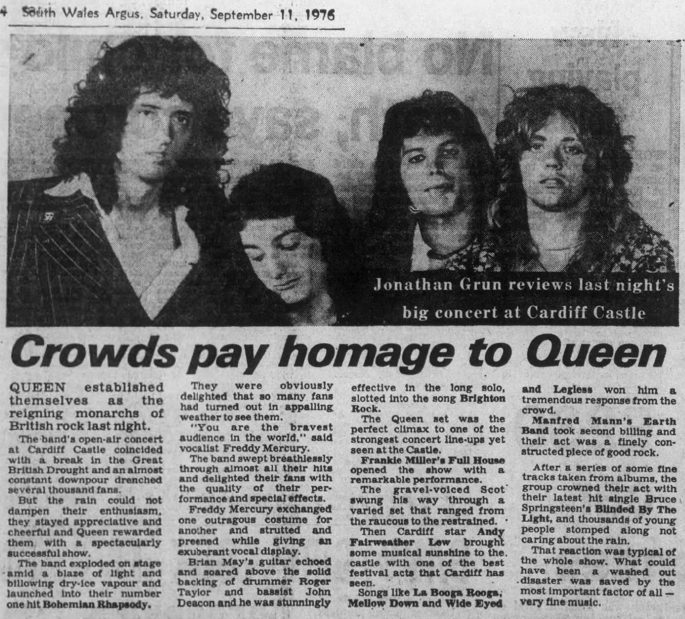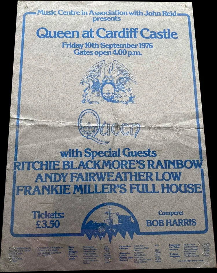 On this day 10 September 1976, legendary British rock band Queen played Cardiff Castle. Also on the bill was Cardiff’s Andy Fairweather-Low, Frankie Miller's Full House and Manfred Mann.