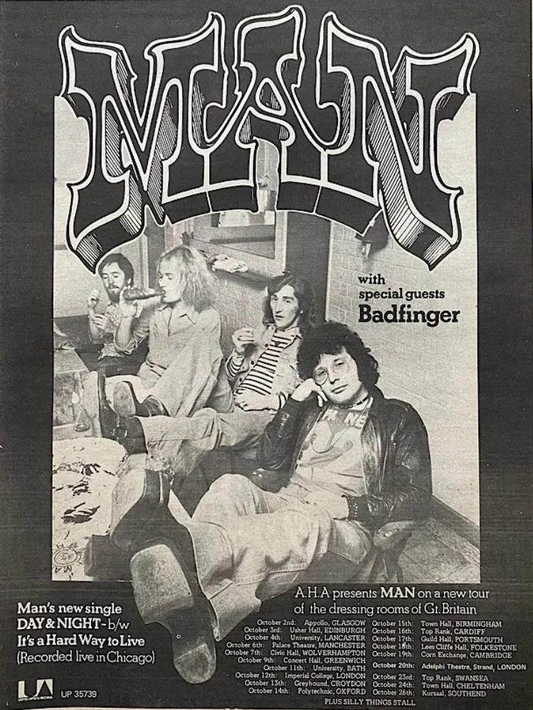 On this day 16 October 1974, Welsh band Badfinger played Cardiff’s Top Rank supporting another Welsh band Man.