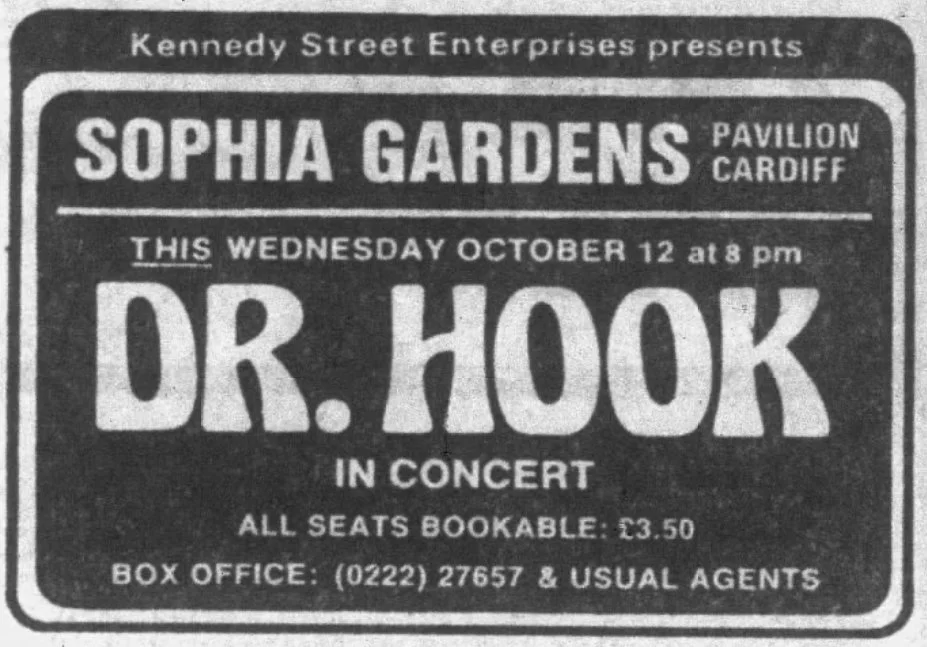 On this day, 12 October 1977, American band Dr Hook played Cardiff’s Sophia Gardens. Support was provided by Alfalpha.