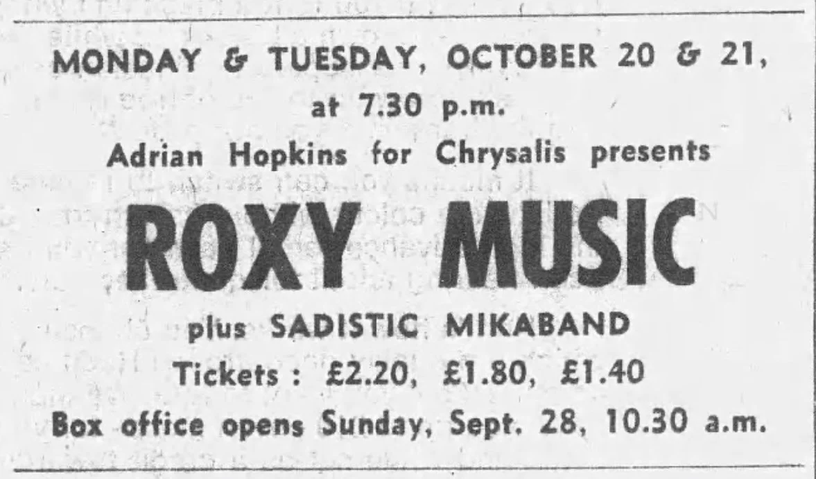 On this day, 20 October 1975, Japanese band the Sadistic Mika Band played Cardiff’s Capitol Theatre supporting Roxy Music.