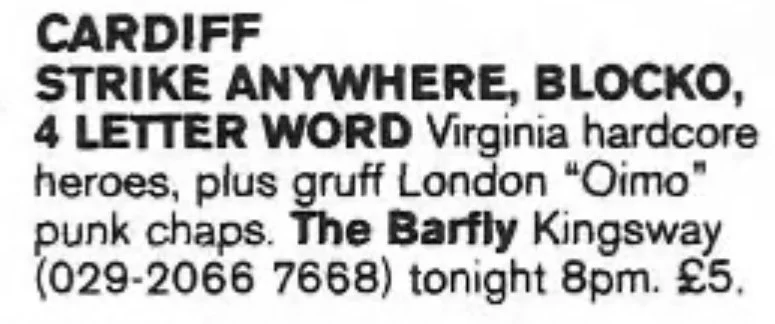 On this day, 22 August 2002, American punk band Strike Anywhere played Cardiff’s Barfly.