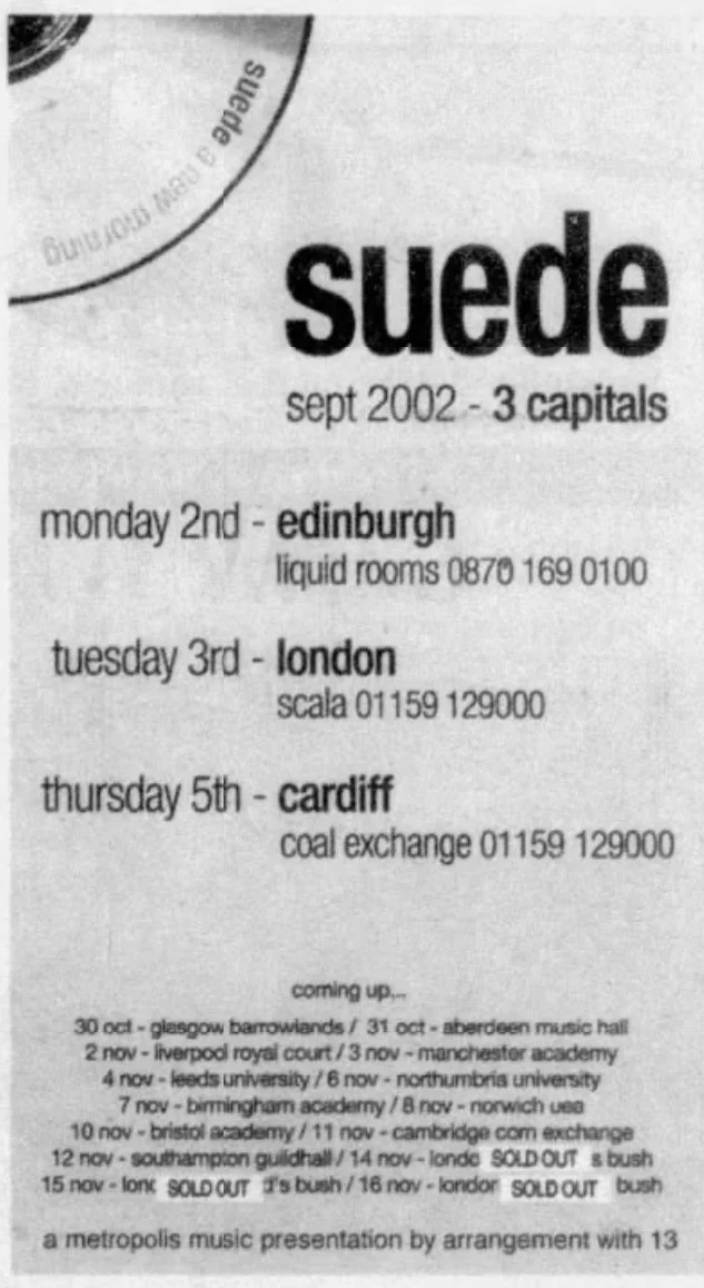 On this day, 5 September 2002, English rock band Suede played Cardiff’s Coel Exchange as part of a three-date preview tour for a full-blown tour to follow in October.