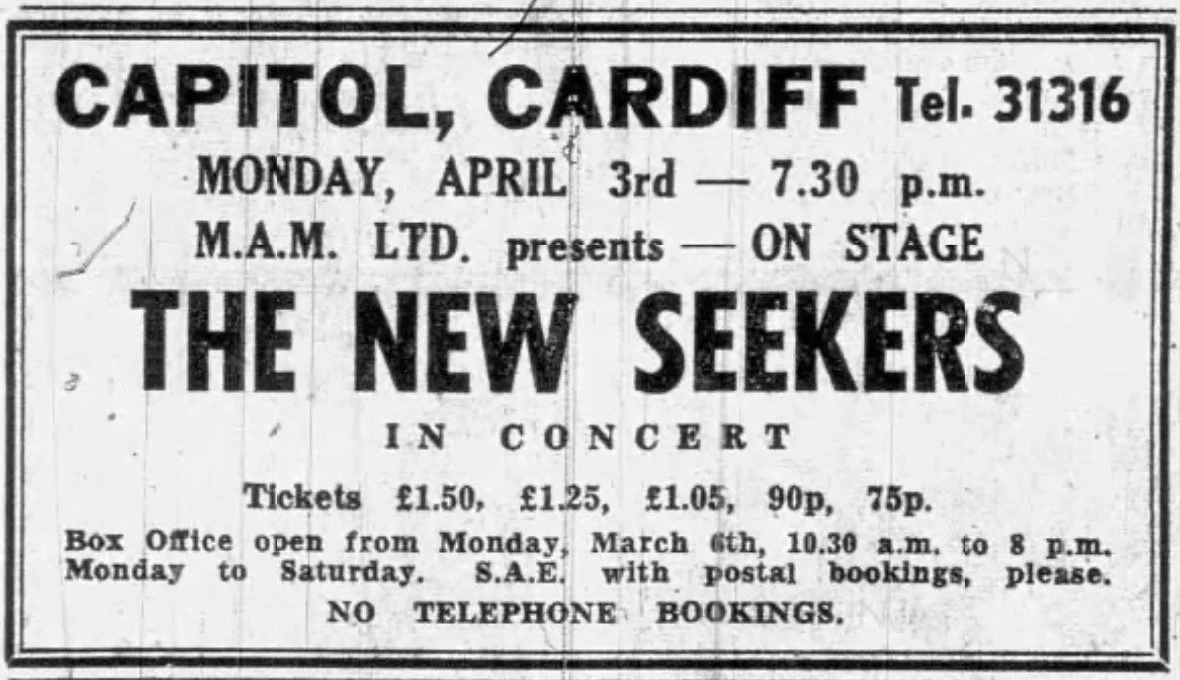 On this day, 3 April 1972, pop group The New Seekers played Cardiff’s Capitol Theatre.