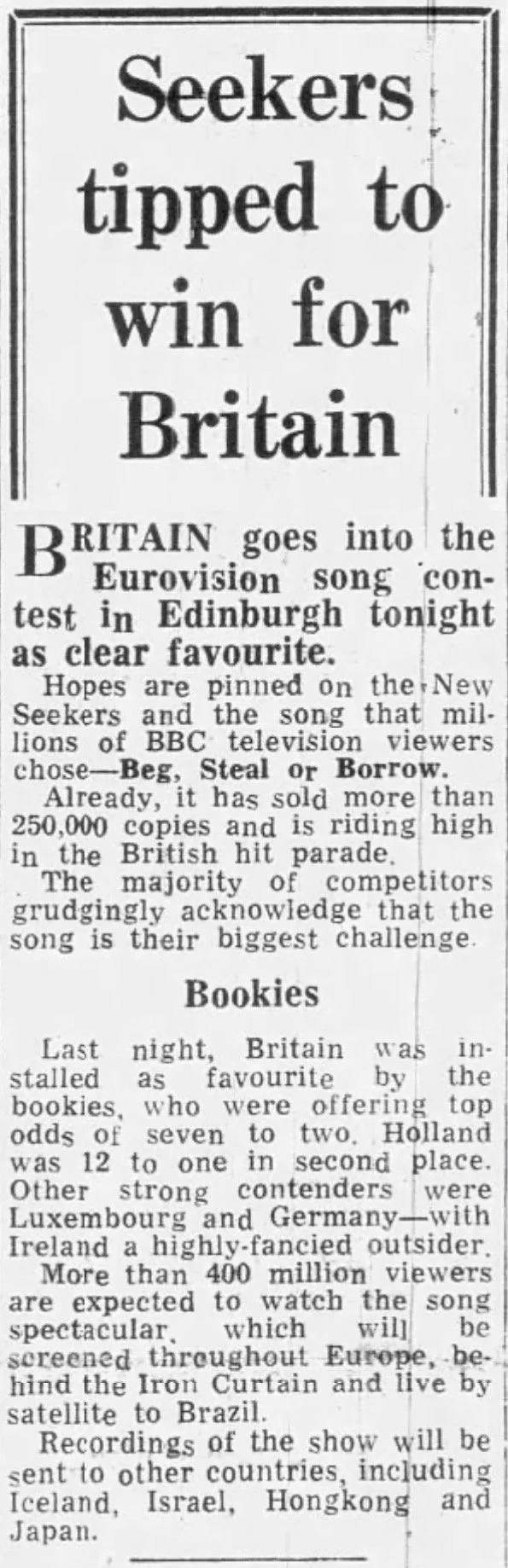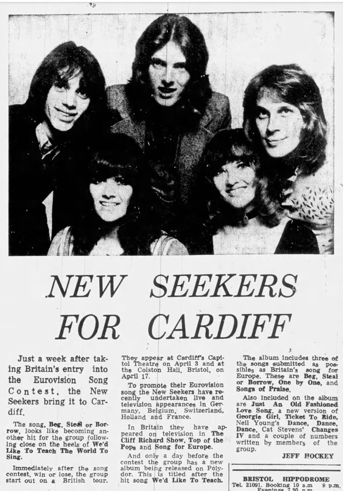 The group were chosen to represent the United Kingdom in the 1972 Eurovision Song Contest. They entered with the song "Beg, Steal or Borrow", which was chosen by viewers of BBC1's It's Cliff Richard! show from six shortlisted songs performed by the group on a weekly basis. They went on to finish in second place at the Eurovision final in Edinburgh, where the group received the biggest cheer of the night from the partisan audience. The song was a No. 2 hit in the UK and sold well in Europe. Around this time, they also charted highly with their most successful album, We'd Like to Teach the World to Sing, which reached No. 2 in the UK Albums Chart. Another top five hit came with the next single, "Circles" in mid 1972.At the end of the year, the group took part in the BBC's anniversary TV show Fifty Years Of Music.
