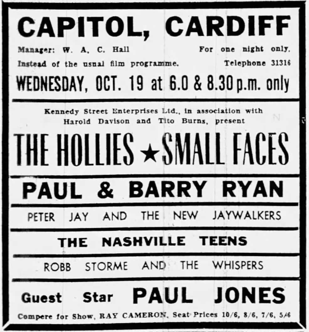 On this day, 19 October 1966, Manchester rock/pop band The Hollies played Cardiff’s Capitol Theatre. Also on their Babies tour bill were The Small Faces, Paul & Barry Ryan, Nashville Teens, Peter Jay & The New Jaywalkers, Robb Storme & The Whispers & Paul Jones.