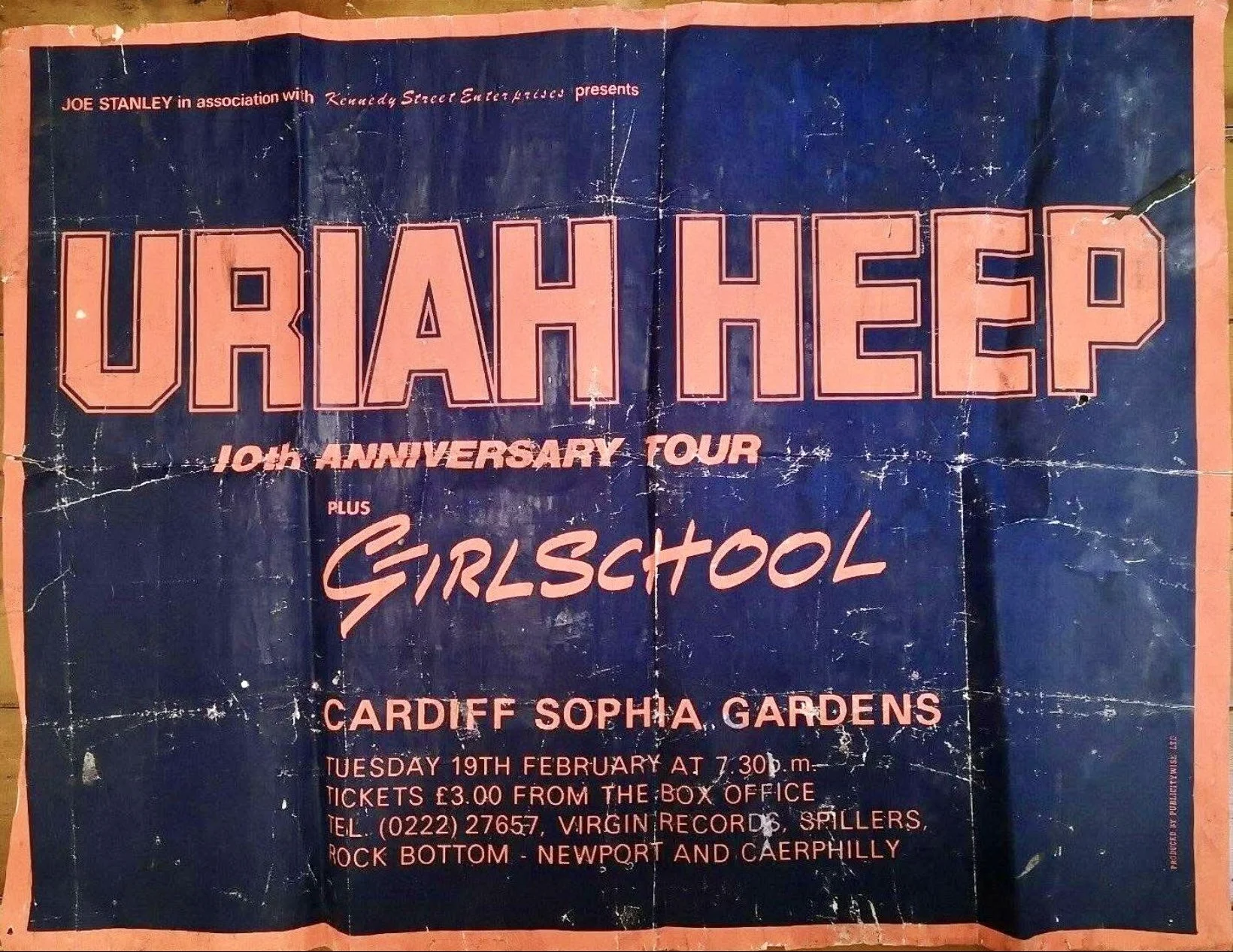 On this day, 19 February 1980, rock band Uriah Heep played Cardiff’s Sophia Gardens. Support was provided by Girlschool. The band featured Cardiff’s John Sloman on vocals.