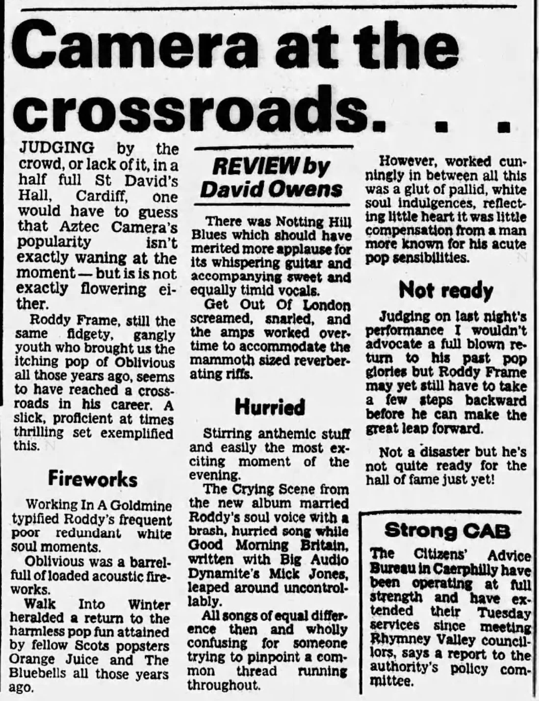On this day, 23 July 1990, Scottish band Aztec Camera played Cardiff’s St David’s Hall. The band or more notably leader and songwriter Roddy Frame had just released his fourth album Stray.