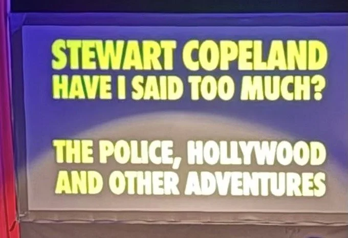 The stage was set with just two armchairs, one each for Stewart Copeland and the interviewer, Lisa Thompson. Stewart was first asked to describe his early life where he grew up in Beirut. Copeland's father Miles was a spy who worked for the CIA. It was while he was attending a American Community school that he first picked up the drumsticks. He had watched his cooler, older brother play with a band called the Black Knights and realised his brother wasn't that good, so he decided to slip into his brother’s room and try the drumsticks himself. This turned out to be a turning point for him, as he was a natural and he was soon recruited and joined the Black Knights.